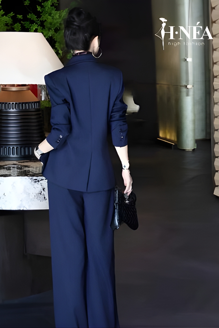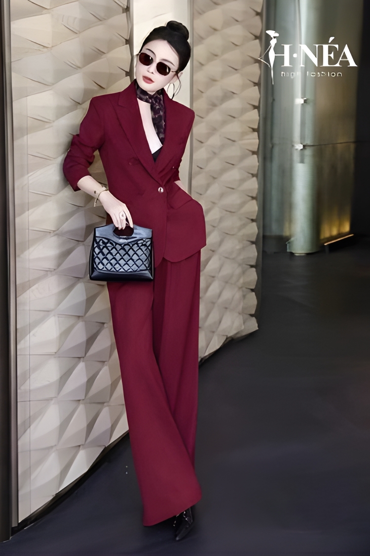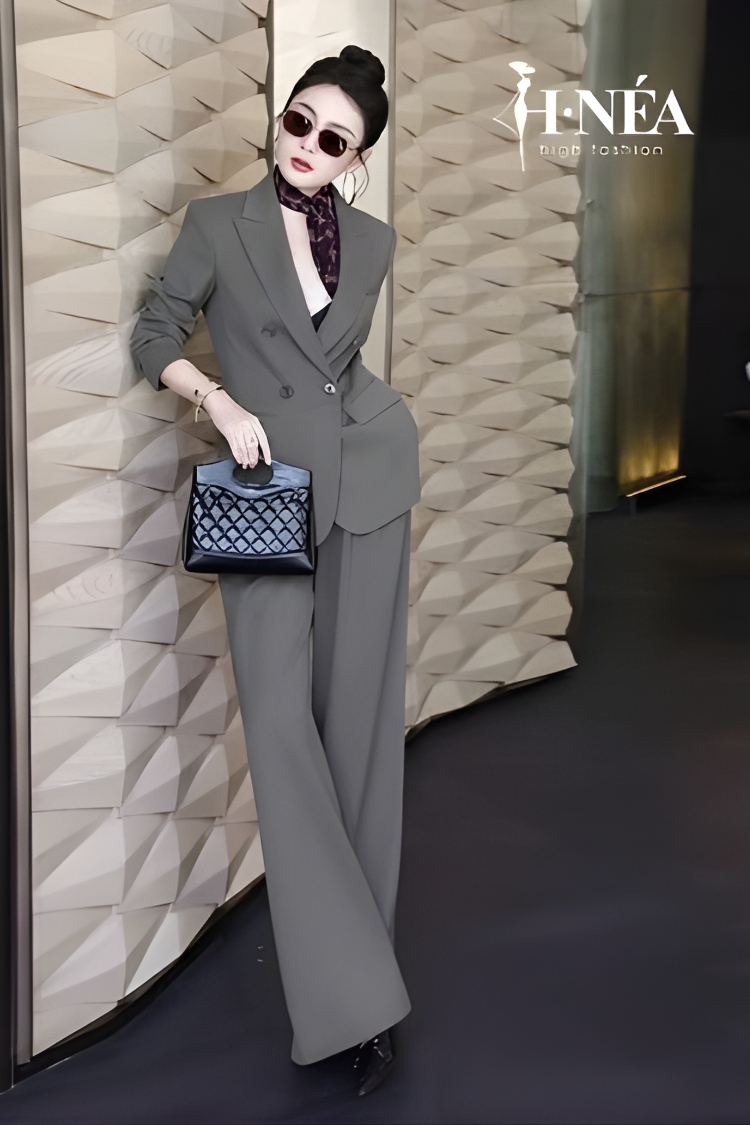 Phom quần suông dài tạo hiệu ứng chân miên man, blazer vai đứng chỉnh chu nhưng vẫn mềm mại nhờ độ rũ chất liệu. Chỉ cần thêm khăn lụa hoặc một chiếc túi có cấu trúc đẹp, outfit văn phòng lập tức trở nên thú vị hơn rất nhiều.