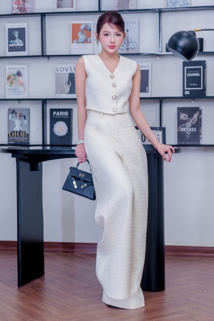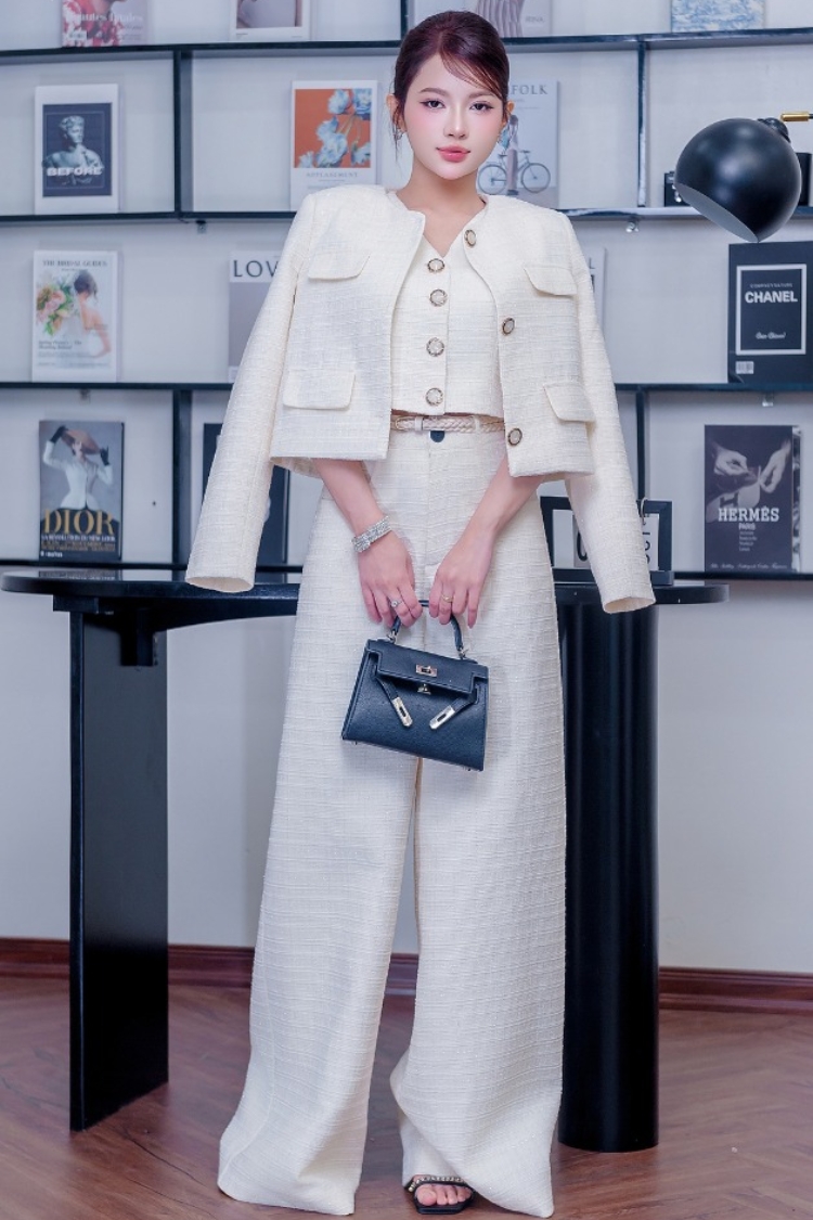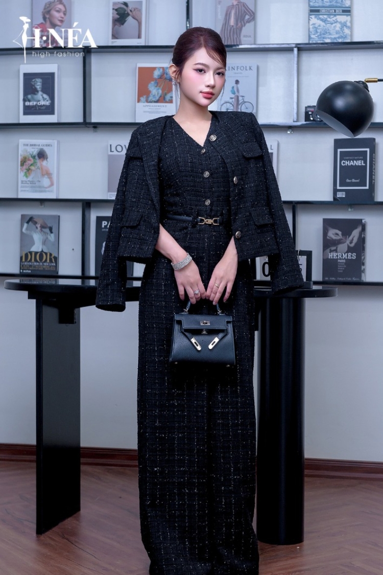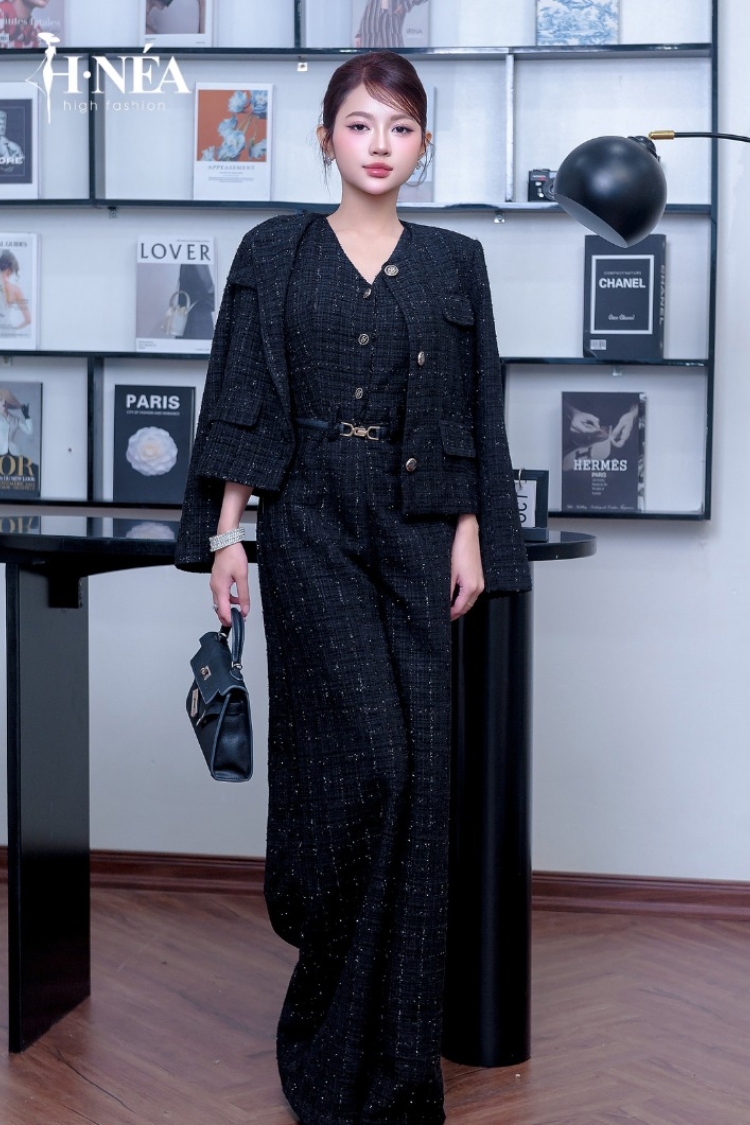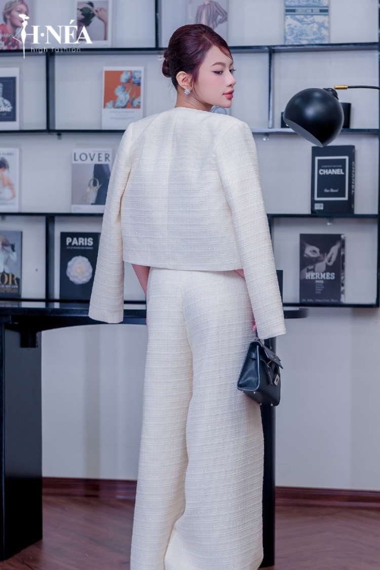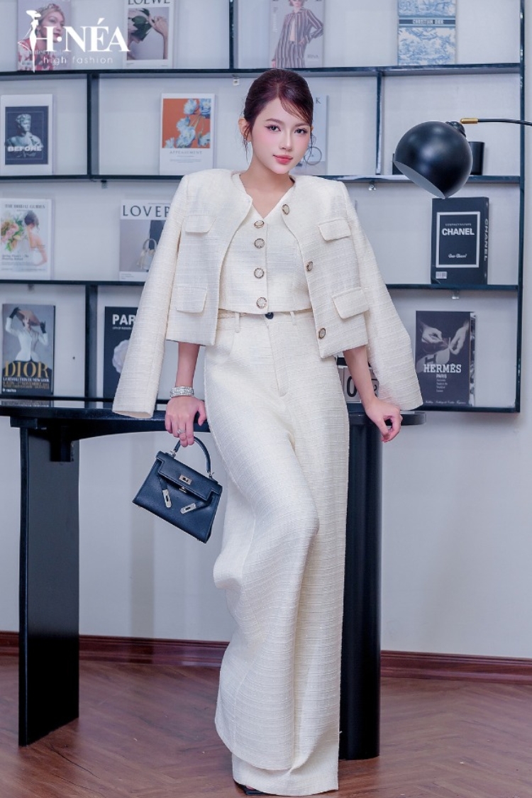 ✨ Tweed cao cấp: lựa chọn quen thuộc cho mùa thu đông. Chất liệu có độ dày vừa phải, giữ phom tốt, tạo bề mặt sang trọng nhưng vẫn thoải mái cho người mặc. Bộ đồ tweed màu trắng kem trong ảnh là ví dụ điển hình: ấm, mềm và cực kỳ dễ phối trong thời tiết chuyển mùa.